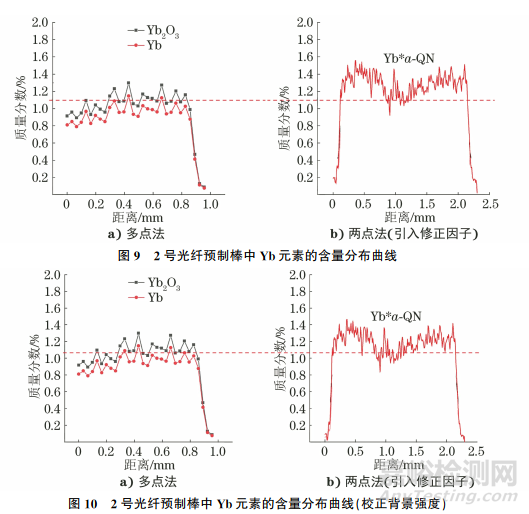 將2號(hào)光纖預(yù)制棒中Yb元素的測試結(jié)果代入圖3的曲線中,并引入Yb元素的修正因子,結(jié)果如圖9所示。發(fā)現(xiàn)引入修正因子后,采用兩點(diǎn)法和多點(diǎn)法測試Yb元素的結(jié)果仍有一定的差異。1號(hào)和2號(hào)光纖預(yù)制棒的背景強(qiáng)度存在差異,因此需要對(duì)2號(hào)試樣Yb元素的背景強(qiáng)度進(jìn)行校正,結(jié)果如圖10所示,可見兩點(diǎn)法和多點(diǎn)法的測試結(jié)果基本一致。
