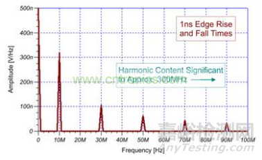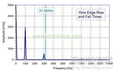 10 ns 邊緣率時(shí)方程式結(jié)果為約 31.8 MHz。曲線圖顯示,最后一次明顯諧波出現(xiàn)在30 MHz。同時(shí),圖 2 所示 1 ns 邊緣率時(shí)方程式結(jié)果為 318 MHz 最大頻率。如果您的電路易受 318 MHz 頻帶內(nèi)產(chǎn)生的頻率影響,則 EMI 諧波可能會(huì)使您的電路出現(xiàn)干擾。