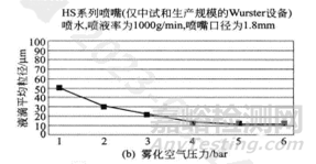即便是在非常高的霧化空氣壓力下,940系列的噴嘴以500g/min的噴液率也不能產(chǎn)生小于20um的液滴。即使該工藝有很強(qiáng)的干燥能力,依然受液滴大小所限制(如細(xì)顆粒包衣),如果升級(jí)到HS噴嘴,它能在同一霧化空氣壓力下使用更為大量的壓縮空氣(約為940系列噴嘴體積的3倍),將大幅度地提高干燥能力。圖6-2描繪的液滴與940系列噴嘴(以250g/min的噴液率)曲線相似,不同的是HS的噴液率為1000g/min,為940系列的4倍。這使HS噴嘴可以在較低的霧化空氣流量和壓力下運(yùn)轉(zhuǎn),從而限制了由高動(dòng)能產(chǎn)生的摩擦效應(yīng)。