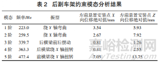 根據(jù)對標數(shù)據(jù)與工程經(jīng)驗,電機懸置安裝點的動剛度目標值設定為 X 向大于 15000 N/mm,Y 向大于8000 N/mm,Z 向大于 15000 N/mm,而分析得左前懸置安裝點 X 向低頻段平均動剛度為 6515 N/mm,高頻段平均動剛度為 5452 N/mm,Z 向低頻段平均動剛度為 9518 N/mm,高頻段平均動剛度為 14273 N/mm,不滿足目標值的要求,影響整車 NVH 性能。為了進一步分析左前懸置動剛度偏弱的具體頻率,以找出針對性的優(yōu)化方法,現(xiàn)調(diào)出其 X 向與 Z 向的原點動剛度頻率響應曲線,如圖 2 所示。從圖可知,X向動剛度較低的兩個低谷主要在 218 Hz 和 463 Hz,Z向動剛度較低的兩個低谷主要在 259 Hz 和 471 Hz左右。對照后副車架約束模態(tài)分析結(jié)果表 2 可知,這些頻率基本都接近后副車架的約束模態(tài),其中 X 向動剛度低谷點頻率接近后副車架 1 階和 5 階約束模態(tài),Z 向動剛度低谷點頻率接近后副車架 2 階和 5 階約束模態(tài),且這幾個頻率下后副車架振型左前懸置安裝點變形位移都很大,所以,在這幾個頻率的激勵力下,后副車架接近發(fā)生共振狀態(tài),從而導致左前懸置支架處變形較大,所以要有針對性的提升這幾個頻率下左前懸置 X 向、Z 向的動剛度,即提升后副車架左前懸置支架在這幾個頻率下抵抗變形的能力,從而對整體的低頻與高頻平均動剛度進行提升[2]。