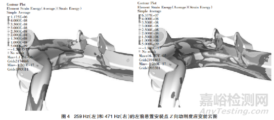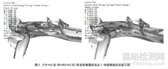 首先在前面動剛度 CAE 分析時就要添加應變能選項,然后從后處理軟件中調(diào)取 218 Hz 和 463 Hz 下X 向動剛度應變能結(jié)果,如圖 3 所示,接著繼續(xù)調(diào)取259 Hz 和 471 Hz 下 X 向動剛度應變能結(jié)果,如圖 4所示。綜合分析可知,后副車架前橫梁與縱梁搭接前端應變能分布較集中,說明此處連接剛度相對較弱,可以增大此處的連接,同時這樣也能更靠近車身安裝套管,剛性更好;前橫梁在左前懸置支架下方部位應變能分布較集中,說明此處對懸置點動剛度貢獻較大,可以加大此處橫截面積;左前懸置左支架翻邊腿附近應變能分布較集中,說明此處剛度有待加強,可以將此翻邊腿向外側(cè)移動,擴大左前懸置左支架與前橫梁的連接投影面積;左前懸置左支架底部兩個翻邊附近應變能分布較集中,說明此處加強比較有作用,可以增加加強板進行加強。