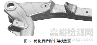 針對以上分析分別對后副車架前橫梁與電機左前懸置支架進行優(yōu)化設計,如圖 5 所示。前橫梁與縱梁搭接前端還有空間可以利用,可以擴大此處的搭接面積,優(yōu)化搭接結(jié)構(gòu),前橫梁與縱梁搭接后端應變能相對較小,為控制材料利用率與重量,此處搭接可以往回縮短。前橫梁在左前懸置支架下方部位橫截面積要加大,即在此處前橫梁上片向上凸起一點(這樣也可以減小懸置支架的懸臂長度),前橫梁下片向上下凸起一點,由于電機懸置包絡間隙需要,上片需要打一處凹坑進行避讓。左前懸置左支架將之前搭在前橫梁上表面的翻邊腿改為搭在前橫梁后側(cè)面,以此增大左前懸置左支架與前橫梁的連接投影面積,增大支架剛度。左前懸置右支架增加一塊焊接加強板,增加支架與前橫梁的連接剛度。整個優(yōu)化設計完成后后副車架的總質(zhì)量沒有增加,在進行提升動剛度性能的同時重充分考慮了輕量化[3]。