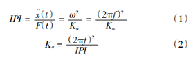 動剛度是動載荷下懸置支架抵抗變形的能力。在CAE 分析軟件中動剛度分析一般采用的是模態(tài)頻率響應方法,輸出的是加速度頻響曲線 IPI,是在一定頻率范圍內(nèi)通過在加載點施加單位力作為輸入激勵,同時將該點作為響應點,測得該點在對應頻率范圍內(nèi)的加速度導納。分析得到 IPI 之后,可以通過對式(1)進行如下轉(zhuǎn)換,得到原點動剛度的計算式(2)。