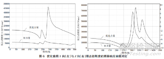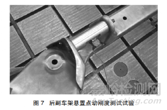 優(yōu)化后電機左前懸置安裝點動剛度明顯提高,低谷值均有提高并后移,如表 3 所示,X 向低頻段平均動剛度為 19197 N/mm,提升了 194.7%,高頻段平均動剛度為 20826 N/mm,提升了 282.0%,Z 向低頻段平均動剛度為 15850 N/mm,提升了 66.5%,高頻段平均動剛度為 20858 N/mm,提升了 46.1%,X 向、Y 向、Z向三向平均動剛度均達到了目標值,其中 X 向與 Z向原點動剛度的頻率響應曲線對比如圖 6 所示。后續(xù)開展了實物樣件的懸置點動剛度測試試驗,如圖 7 所示,進一步驗證了分析的準確性與優(yōu)化設計的有效性。