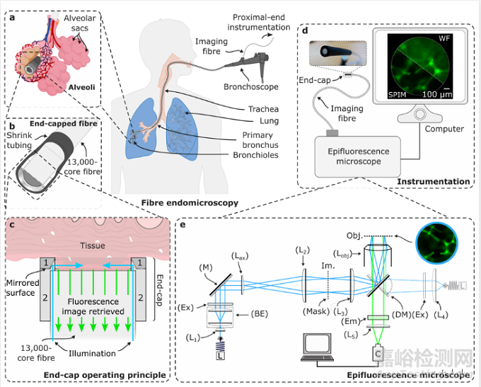 基于此,西班牙坎塔布里亞大學(xué)的Pablo Roldán-Varona(一作)和英國(guó)赫瑞瓦特大學(xué)的Helen E. Parker(通訊)等人在商用塑料相干光纖束頭端附加一個(gè)熔融石英端蓋,使得激發(fā)光路和成像光路不共用光纖纖芯,既實(shí)現(xiàn)了平面選擇照明,又實(shí)現(xiàn)了塑料光纖接收熒光成像而不產(chǎn)生背景熒光。