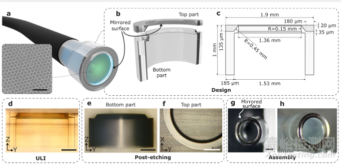 (1) 激發(fā)光和熒光光路分離。使用環(huán)形激發(fā)光入射外圍光纖,并照射在一個(gè)附加的反射鏡片端蓋上,反射鏡面具有曲率,將光近似聚焦成一個(gè)與光纖光軸垂直的平面,激發(fā)的熒光被中心的光纖束接收成像。環(huán)形激發(fā)光由圖1e的角錐透鏡Lax實(shí)現(xiàn)。塑料光纖束為PMMA CFB(MCL-1500-1.75, Asahi Kasei Co.)。光纖詳細(xì)結(jié)構(gòu)參數(shù)見附錄。