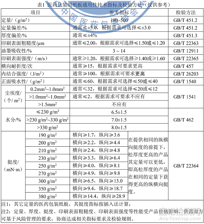 醫(yī)藥包裝紙板的通用性技術(shù)指標及檢驗方法可參考表1。
