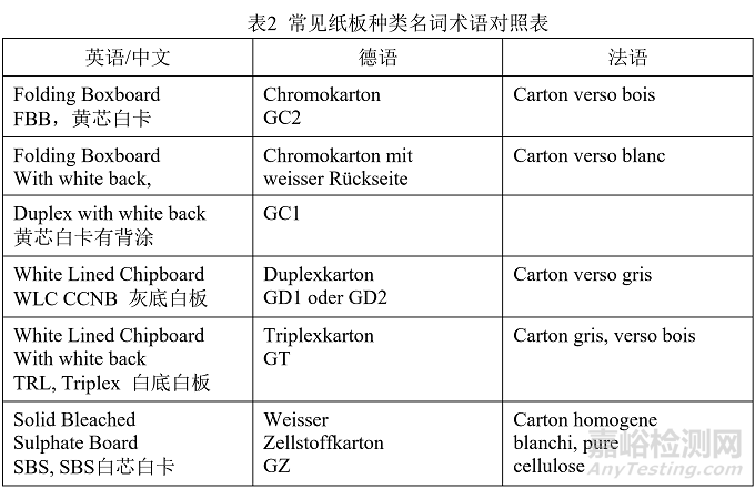表2 常見紙板種類名詞術(shù)語對照表