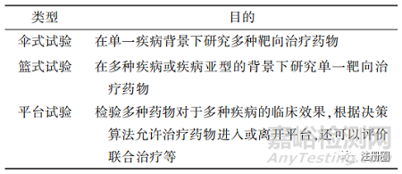傳統(tǒng)的創(chuàng)新藥臨床試驗一般需要從零開始建立一個獨立的申報和執(zhí)行體系,且僅能夠評估面向同一種疾病的一種或幾種固定藥物,導(dǎo)致資源重復(fù)、利用率低下。美國FDA所提倡的現(xiàn)代化主方案試驗設(shè)計允許在總試驗框架下同時評估一種以上的研究藥物或生物制劑、一種以上的疾病類型或一種以上的患者群體(見表1),以此提高腫瘤藥的研發(fā)效率。美國FDA于2018年9月發(fā)布了2個與主方案相關(guān)的行業(yè)指南草案[12],以規(guī)范和引導(dǎo)腫瘤及其他領(lǐng)域中主方案的設(shè)計和執(zhí)行。