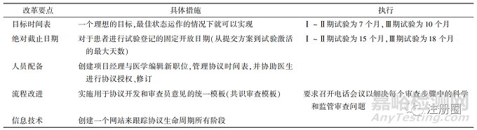 美國NIH的國家癌癥研究所(National Cancer Institute,NCI)長期以來一直贊助腫瘤藥物開發(fā)工作,為應(yīng)對創(chuàng)新藥臨床試驗啟動延遲的難題,NCI的運營效率工作組于2010年出臺了一項關(guān)于臨床試驗啟動改革的計劃,以壓縮癌癥臨床試驗激活的時間線。該項計劃包括人員增加、流程改進和信息技術(shù)創(chuàng)新[17],詳細內(nèi)容見表3。