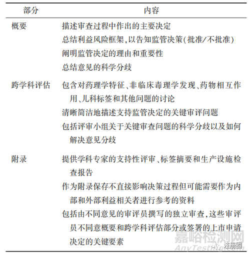 NDRP計劃的另一項關(guān)鍵工作是開發(fā)綜合審評流程和文件模板,這是評估新藥上市申請(new drug applications,NDA)和生物制品許可申請(biologics license applications,BLA)的更新流程。新流程中,美國FDA的科學(xué)審查人員組成一個跨學(xué)科團隊,共同討論擬上市藥品的安全性、有效性等一系列關(guān)鍵問題,同時圍繞關(guān)鍵問題和潛在的收益?風(fēng)險撰寫一篇評論,在新藥或生物制劑批準后,公開發(fā)布包含概要、跨學(xué)科評估和附錄的綜合審評文件[23](見表4)。