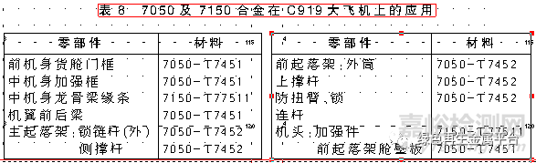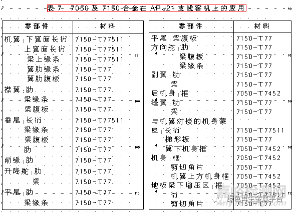 7050合金在中國(guó)有完全自主知識(shí)產(chǎn)權(quán)的支線客機(jī)ARJ21與大飛機(jī)C919上的結(jié)構(gòu)中獲得了較多的應(yīng)用,但是制造原型機(jī)用的材料則是進(jìn)口的。ARJ21客機(jī)的下列零件用的是7050合金(表7),C919大飛機(jī)上7050合金零部件見表8。