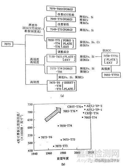 (a)7XXX系航空航天合金的發(fā)展進(jìn)程示意圖(見圖中FORG-鍛件,PLATE-厚板,CXT-擠壓材,SHEET-薄板,SCC-應(yīng)力腐蝕開裂);