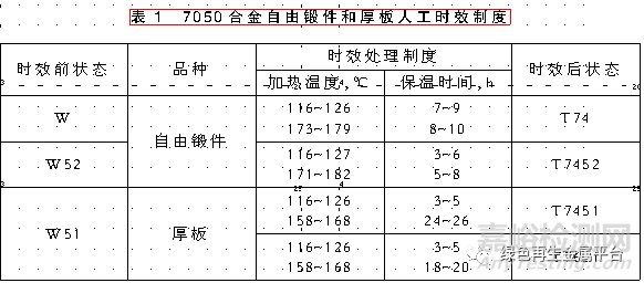 7050合金鍛件的固溶處理溫度468℃~474℃,在54℃~66℃溫水中淬火(按Q/6SZ925);厚板固溶處理溫度471℃~482℃,在室溫涼水中淬火,轉(zhuǎn)移時(shí)間≤15S,最好在輥底式爐內(nèi)固溶爐內(nèi)處理,人工時(shí)效制度見表1。