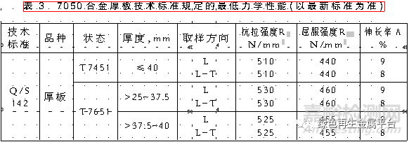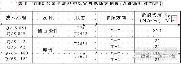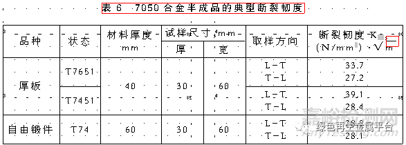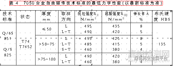 技術(shù)標(biāo)準(zhǔn)規(guī)定的7050合金力學(xué)性能見表3~4,材料的斷裂韌性見表5~6,其他力學(xué)性能可查閱有關(guān)手冊(cè)。
