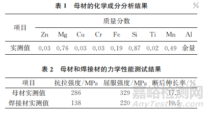 試驗(yàn)選用材料為6082-T6鋁合金,材料厚度為6mm,母材的化學(xué)成分分析結(jié)果如表1所示,母材和焊接材的力學(xué)性能測(cè)試結(jié)果如表2所示。