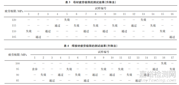 采用升降法測(cè)試材料的疲勞極限,有效試樣約為15根,在約4級(jí)應(yīng)力水平下進(jìn)行試驗(yàn),應(yīng)力增量為預(yù)計(jì)疲勞極限的5%,使第一根試樣的應(yīng)力水平略高于預(yù)計(jì)疲勞極限;根據(jù)上一根試樣的測(cè)試結(jié)果決定下一根試樣的試驗(yàn)應(yīng)力,如果上一根試樣失效,則降低一級(jí)應(yīng)力,如果上一根試樣通過,則升高一級(jí)應(yīng)力,直至完成全部試驗(yàn);根據(jù)有效數(shù)據(jù)的終點(diǎn)為“通過”或“失效”,設(shè)想在某一應(yīng)力水平還存在1個(gè)數(shù)據(jù)點(diǎn),若該點(diǎn)與有效數(shù)據(jù)的起點(diǎn)位于同一應(yīng)力水平上,則表示閉合。采用升降法測(cè)試母材和焊接材疲勞極限的結(jié)果如表3,4所示。