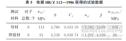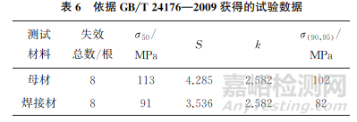 表6為依據(jù)GB/T 24176—2009獲得的試驗(yàn)數(shù)據(jù)。由 表5,6可知:依 據(jù) HB/Z 112—1986和GB/T 24176—2009獲得的材料中值疲勞強(qiáng)度結(jié)果相同,母材為113MPa,焊接材為91MPa;在置信度為95%、可靠度為90%的條件下,標(biāo)準(zhǔn)正態(tài)偏量法和單邊誤差限法獲得的安全疲勞極限結(jié)果存在差異,采用標(biāo)準(zhǔn)正態(tài)偏量法獲得的母材和焊接材的安全疲勞極限分別為108MPa和86MPa,采用單邊誤差限法獲得的母材和焊接材的安全疲勞極限分別為102MPa和82MPa。