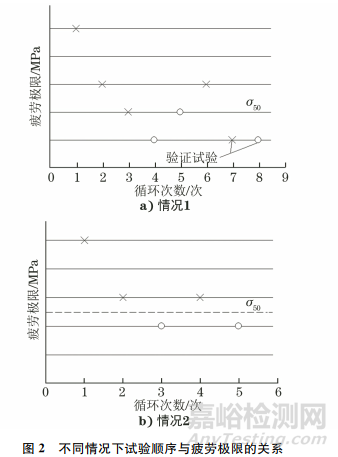 (2)情況2,如果在某級(jí)應(yīng)力水平下,超過半數(shù)的試樣未至指定循環(huán)次數(shù)就發(fā)生“失效”,而在比該應(yīng)力水平低一級(jí)的應(yīng)力水平下,試驗(yàn)至指定循環(huán)次數(shù)時(shí)全部試樣均“通過”,則上述兩級(jí)應(yīng)力水平的平均值為疲勞極限[見圖2b)]。
