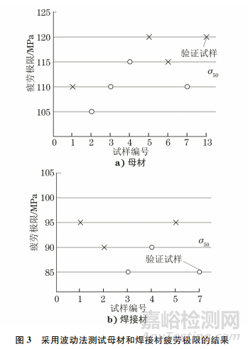 (3)采用升降法測(cè)試疲勞極限一般需要約15根有效試樣,而采用波動(dòng)法測(cè)試僅需5~8根試樣,兩者測(cè)試結(jié)果差異在一個(gè)應(yīng)力臺(tái)階以內(nèi),采用波動(dòng)法進(jìn)行測(cè)試可顯著縮短測(cè)試時(shí)間、降低測(cè)試成本,在試樣數(shù)量較少時(shí)推薦使用波動(dòng)法。