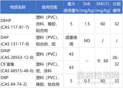 GB 9685只允許使用少數(shù)幾個鄰苯類物質(zhì)(塑化劑),并且規(guī)定了使用范圍、最大使用量和遷移限量,詳見下表。