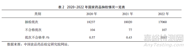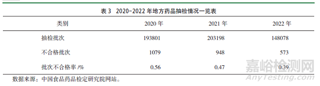 2020-2022年國家和地方藥品抽檢批次不合格率總體有所降低,例如,國家藥品抽檢批次不合格率在2021年同比下降24.56%,2022年同比上升46.51%,地方藥品抽檢批次不合格率在2021年、2022年分別同比下降16.07%、17.02%,具體詳見表2、表3。