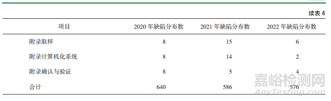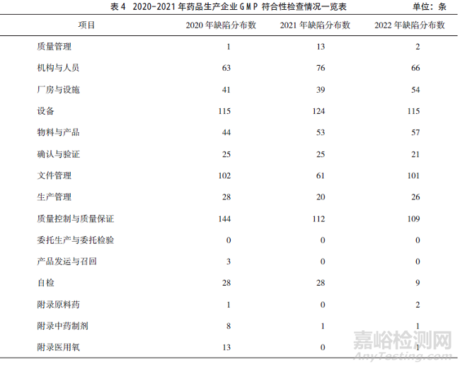 隨機抽取某省2020-2022年150家次(50家次/年)藥品生產(chǎn)企業(yè)現(xiàn)場檢查數(shù)據(jù),對照2010年版《藥品生產(chǎn)質(zhì)量管理規(guī)范》進行統(tǒng)計分析,2020年現(xiàn)場檢查發(fā)現(xiàn)嚴(yán)重缺陷1條,主要缺陷9條,一般缺陷630條;2021年發(fā)現(xiàn)嚴(yán)重缺陷9條,主要缺陷1條,一般缺陷576條;2022年發(fā)現(xiàn)嚴(yán)重缺陷2條,主要缺陷20條,一般缺陷554條;缺陷項目主要集中在質(zhì)量控制與質(zhì)量保證、設(shè)備、文件管理、機構(gòu)與人員。由此可見,一方面隨著職業(yè)化專業(yè)化藥品檢查員整體素質(zhì)的不斷提高,現(xiàn)場檢查發(fā)現(xiàn)嚴(yán)重缺陷項目和主要缺陷項目的能力在逐年提升;另一方面企業(yè)主體責(zé)任還有待進一步落實,企業(yè)自查自律還有待進一步強化?,F(xiàn)場檢查發(fā)現(xiàn)缺陷項目具體分布情況詳見表4。