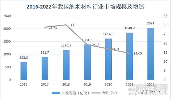 近年來,我國納米材料市場規(guī)模保持增長趨勢,從2017年的891.7億元增加到2021年的1848.2億元。2022年,中國納米材料的市場規(guī)模達到2031億元,與2021年的市場規(guī)模相比增長了9.89%。
