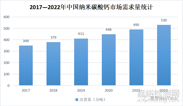 近年來,隨著碳酸鈣的超細化、結構復雜化及表面改性技術的發(fā)展,其需求量呈不斷增長的狀態(tài)。據(jù)統(tǒng)計,2017年中國納米碳酸鈣的需求量為349萬噸,到了2021年,中國納米碳酸鈣的需求量達到了490萬噸,在納米材料市場的占比未93.62%,較2017年增加141萬噸。2022年,中國納米碳酸鈣的需求量將達到530萬噸,較2021年增加40萬噸。