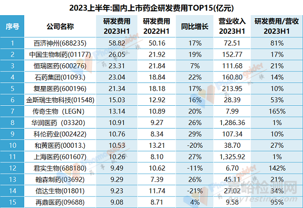 2、研發(fā)一哥還是百濟神州,2023年上半年研發(fā)費用支出58.82億元,同比增長17%。TOP5的研發(fā)費用支出超過20億元,排名第二的為中國生物制藥,2023上半年研發(fā)費用增長19%,達到26.05億元,恒瑞醫(yī)藥今年上半年研發(fā)投入保持7%的個位數(shù)增長。