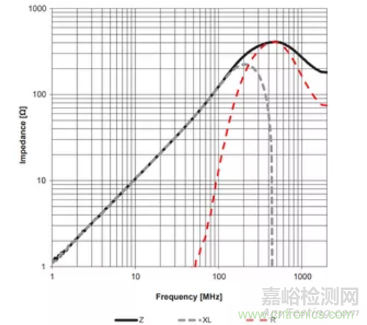 從直流電(DC,0Hz)直到諧振頻率fr,鐵氧體磁珠的阻抗行為都是感性的。