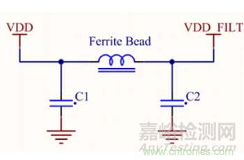 差分噪聲濾波器的示例(鐵氧體磁珠L(zhǎng)1和電容器C1)。