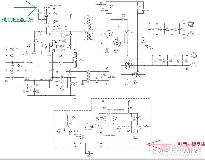 副邊反饋是直接檢測副邊輸出電壓,通過隔離電路(常為光耦)將輸出電壓信號轉(zhuǎn)化為電流信號,接至控制芯片側(cè),或者通過耦合電感反饋。還可以直接反饋,當(dāng)然直接反饋就失去了隔離的意義。