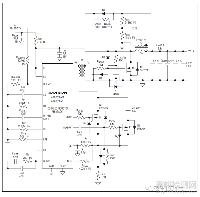 我們以美信(現(xiàn)在已經(jīng)被ADI收購)的芯片MAX5974A為寬輸入電壓范圍、有源鉗位、電流模式PWM控制器,用于控制以太網(wǎng)供電(PoE)的用電設(shè)備中的反激轉(zhuǎn)換器。MAX5974A適用于通用或電信系統(tǒng)的輸入電壓范圍。芯片MAX5974A獨(dú)特的電路設(shè)計(jì)能夠在不需要光耦的前提下獲得穩(wěn)定的輸出。既可以利用變壓器,也可以利用光耦進(jìn)行反饋。