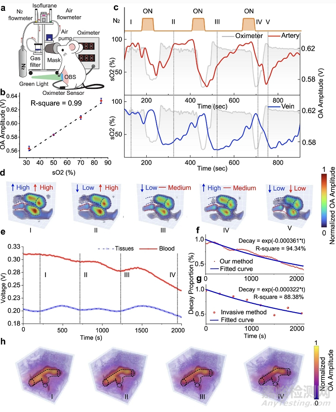 圖2、a 用于活體動物測試的缺氧實(shí)驗(yàn)裝置。b 氧飽和度和光聲(OA)幅度之間的線性相關(guān)性。c 缺氧試驗(yàn)中OBS測得的OA信號峰值趨勢線。橙色區(qū)域代表氮?dú)夤?yīng)的低氧狀態(tài),藍(lán)線和紅線分別是靜脈和動脈的 OA 幅度?;疑珔^(qū)域代表血氧計(jì)測量的氧飽和度。d 在 30 秒、320 秒、520 秒、710 秒和 760 秒時三維重建的小鼠血氧圖的快照圖像。e OBS測量的OA信號峰峰值趨勢線用于血管內(nèi)外源性藥物濃度監(jiān)測。羅丹明B在血管(紅線)和組織(藍(lán)線)中的代謝呈現(xiàn)隨時間衰減的趨勢。f從 OBS 測量的血液中若丹明 B 的衰減趨勢(紅線)。g 體外熒光法測得的若丹明B在血液中的衰減趨勢(紅點(diǎn))。h 在 200 秒、700 秒、1200 秒和 1900 秒時濃度衰減測試中小鼠若丹明 B 濃度的三維快照圖像。血液中的若丹明 B 呈橙色,而組織中的若丹明 B 呈紫色。
