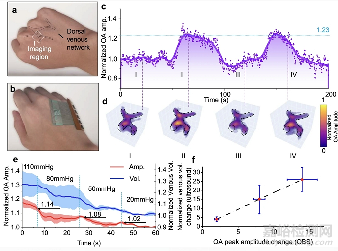 圖3、a 手背靜脈網(wǎng)輪廓照片,其中圖像區(qū)域用白色虛線框表示。b OBS佩戴在手上的照片。c 來自 OBS 的 OA 信號峰到峰值的趨勢線。d 20 秒、70 秒、120 秒和 170 秒時的三維血管圖像快照,其中虛線顯示靜脈網(wǎng)輪廓。e 不同壓力下峰值振幅與容積比的比較。隨著閉塞壓力的降低,峰值振幅和體積均減小。f 不同袖帶壓力下OBS測量的峰值振幅比變化與超聲測量的靜脈容積比變化之間的線性相關(guān)性。