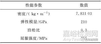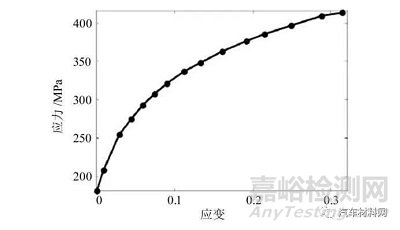 薄壁金屬構(gòu)件受到撞擊時產(chǎn)生的褶皺形變越大,吸能效果越好,也更適用于轎車的前縱梁。模擬碰撞試驗選用的是正四邊形截面形狀的直薄壁梁構(gòu)件[7],長度為140 mm,壁厚為1.75 mm,材料為分段線性彈塑性鋼材,其性能參數(shù)見表1,應(yīng)力-應(yīng)變曲線如圖1所示。
