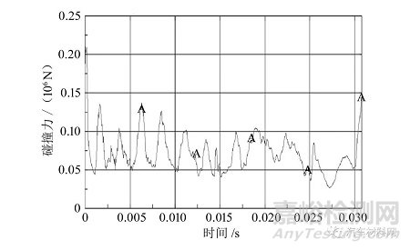 模擬碰撞過程中,得到碰撞力曲線如圖5所示,由圖可知,在0 s和0.03 s時曲線的波峰比其他時間要高,這是因為碰撞開始時碰撞力最大,所以波峰最高,在0—0.03 s前縱梁被壓潰產(chǎn)生形變,這些形變會吸收相應(yīng)的能量,碰撞能量逐漸減少,但在0.03 s時由于前縱梁被壓縮到極限,不能繼續(xù)產(chǎn)生形變吸收能量,故曲線波峰突然劇增。