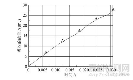 吸能曲線如圖6所示。由圖可以看出,前縱梁在0—0.03 s產(chǎn)生了連續(xù)折疊形變,把這種形變定義為褶皺形變,每產(chǎn)生一個褶皺形變都要消耗相應(yīng)的能量,因此該階段被消耗的能量逐漸增多。但是前縱梁的壓縮空間是有限的,當(dāng)前縱梁沒有繼續(xù)被壓縮的空間時其剛性迅速增強,碰撞力急劇上升,之后能量吸收為零,故在0.03 s消耗的能量迅速增大,之后能量不再被吸收。
