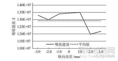 縱向誤差分別取-3.0,-2.0,-1.0,1.0,2.0,3.0 mm,通過有限元仿真繪出縱向誤差-前縱梁吸能關(guān)系曲線圖,如圖8所示。由圖可知,縱向誤差在-1.0~1.0 mm時前縱梁的吸能效果較好,并且在誤差為1.0 mm時達(dá)到最好。