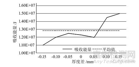 由于制造前縱梁的材料不是全部相同的,取同一種材料不同批次、不同厚度來進(jìn)行仿真分析,厚度誤差分別取值為-0.15,-0.10,-0.05,0.05,0.10,0.15 mm。通過有限元仿真繪出厚度差-前縱梁吸能關(guān)系曲線圖,如圖9所示。由圖可知,同一材料的板厚誤差不大于0.05 mm時,縱梁吸能特性波動較小,板厚誤差超過0.05 mm以后吸能特性明顯增加,隨著厚度的增加吸能效果顯著增加,但是考慮到汽車的輕量化,因此板的厚度不能太大。