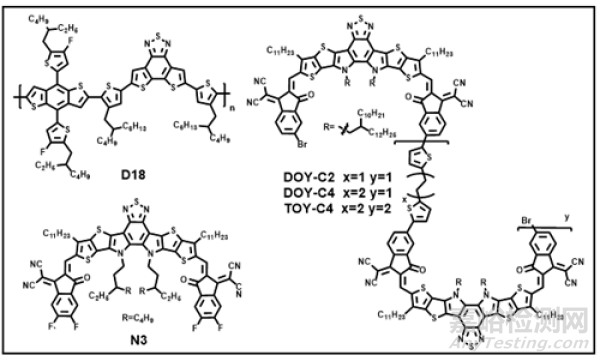 ▲圖1. 聚合物給體D18、小分子受體N3、寡聚物受體材料結(jié)構(gòu)