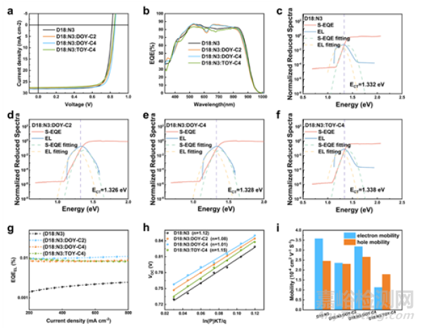 為探究寡聚物受體作為第三組份對(duì)于有機(jī)太陽(yáng)能電池效率的影響,該研究制備了相應(yīng)的剛性電池器件。研究通過(guò)對(duì)電池各種參數(shù)的表征測(cè)試發(fā)現(xiàn),寡聚物受體摻入后主要通過(guò)降低有機(jī)太陽(yáng)能電池中的非輻射能量損失進(jìn)而提高電池的開(kāi)路電壓。其中,基于D18:N3:DOY-C4的器件表現(xiàn)出19.01%的剛性光電轉(zhuǎn)化效率和17.91%的柔性光電轉(zhuǎn)化效率。這一柔性效率是目前報(bào)道的柔性有機(jī)太陽(yáng)能電池的最高效率之一。