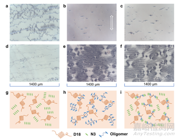 進(jìn)一步,研究對(duì)活性層材料進(jìn)行拉伸測(cè)試。相較于D18:N3混合膜表現(xiàn)出的7.8%的斷裂拉伸率,摻雜15%寡聚物DOY-C4后的混合膜則表現(xiàn)出接近12%的斷裂拉伸率,同比增長(zhǎng)超過(guò)50%。研究通過(guò)對(duì)不同薄膜拉伸后形貌的分析提出,柔性寡聚物受體能夠與聚合物給體之間形成類(lèi)纏結(jié)的行為,且這種行為導(dǎo)致薄膜力學(xué)性能的顯著增長(zhǎng)。