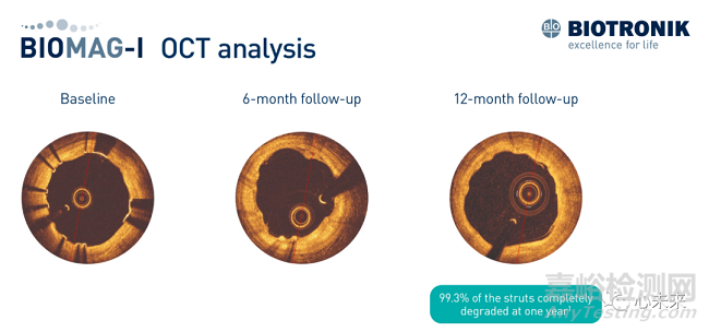 2023年9月1日,德國全球化心血管企業(yè)百多力(BIOTRONIK)公布了 BIOMAG-I 研究的最新成果,光學(xué)相干斷層掃描(OCT)分析證實其新型可吸收鎂支架 DREAMS 3G 在12個月時被吸收。