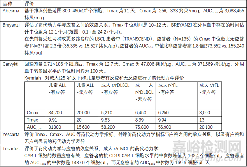 藥代動(dòng)力學(xué)評(píng)價(jià)考量為回輸后CAR-T細(xì)胞的增殖、分化等變化,以Tmax Cmax AUC等表示。