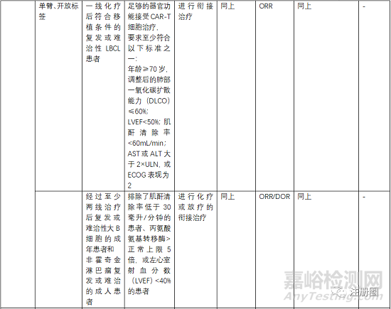 受試者篩選的患者一般為3線或末線,這就決定了給藥方案為單臂設(shè)計(jì),另外對(duì)患者的入排標(biāo)準(zhǔn)進(jìn)行嚴(yán)格控制,因?yàn)榻?jīng)過末線治療的患者比較虛弱,很多條件達(dá)不到輸注的標(biāo)準(zhǔn)。安全性一般重點(diǎn)關(guān)注CRS、神經(jīng)毒性和嚴(yán)重感染,需要進(jìn)行住院監(jiān)測(cè)和手段干預(yù)。一般CRS等持續(xù)時(shí)間最多14天,所以臨床試驗(yàn)中常安排監(jiān)測(cè)7天或14天另外對(duì)于CRS等治療常使用糖皮質(zhì)激素和托珠單抗。在回輸前需要銜接治療和淋巴清除化療。由于單采后CAR-T生產(chǎn)需要一定的時(shí)間,一般為10-20天生產(chǎn)時(shí)間,然后進(jìn)行回輸,回輸時(shí)間為單采后的15-30天,所以,有的患者在此段時(shí)間內(nèi)會(huì)發(fā)生死亡或者變得不符合回輸治療的標(biāo)準(zhǔn)。