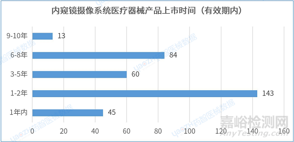 據(jù)統(tǒng)計(jì),從產(chǎn)品進(jìn)入市場(chǎng)的平均時(shí)間來(lái)看,在有效期內(nèi)的內(nèi)窺鏡攝像系統(tǒng)醫(yī)療器械產(chǎn)品的上市時(shí)間在1-2年的產(chǎn)品數(shù)量最多,有143件。