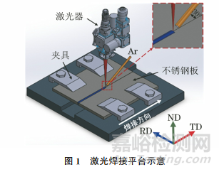 試驗(yàn)材料為固溶態(tài)S32101雙相不銹鋼板,厚度為6.5mm,由太原鋼鐵集團(tuán)提供,其化學(xué)成分(質(zhì)量分 數(shù)/%)為 0.02C,21.64Cr,1.42Ni,0.19N,0.52Si,5.21Mn,0.13Cu,0.16Mo,余Fe。在不銹鋼板上取尺寸為160mm×75mm×6.5mm的待焊試樣,長(zhǎng)邊方向平行于軋件的橫向(TD),短邊方向平行于軋制方向(RD),對(duì)其待焊面進(jìn)行打磨和清洗。使用如圖1(圖中ND為軋制面法向)所示的激光焊接平臺(tái)進(jìn)行激光對(duì)接焊,不開坡口,焊接功率為3kW,焊接速度為50cm·min-1,離焦量為-2mm,純氬氣保護(hù),焊接方向沿待焊試樣長(zhǎng)邊方向(平行于TD)。焊接完成后,以焊縫為中心垂直焊接方向取尺寸為10mm×8mm×6.5mm的待熱處理試樣。