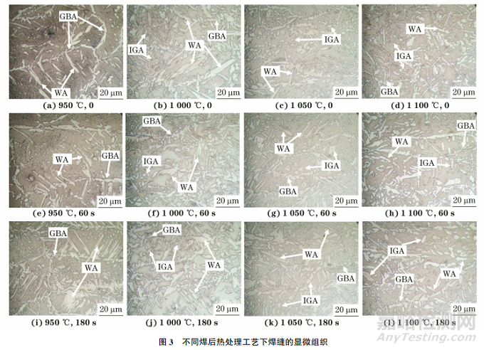 圖3中亮白色相為奧氏體相,暗灰色相為鐵素體相。由圖3可見,與焊態(tài)焊縫相比,不同條件熱處理后的焊縫中均形成了魏氏奧氏體(MA)。當(dāng)熱處理溫度升高到1000℃及以上時(shí),焊縫中除了存在晶界奧氏體外,還出現(xiàn)了晶內(nèi)奧氏體(IGA)。當(dāng)溫度由950℃升高至1050 ℃時(shí),魏氏奧氏體長(zhǎng)大粗化,同時(shí)晶內(nèi)奧氏體持續(xù)析出,奧氏體數(shù)量增多;當(dāng)溫度繼續(xù)升高至1100℃時(shí),部分魏氏奧氏體轉(zhuǎn)變成鐵素體。在同一熱處理溫度下,隨著保溫時(shí)間的延長(zhǎng),焊縫中的晶界奧氏體、晶內(nèi)奧氏體和魏氏奧氏體均發(fā)生長(zhǎng)大。